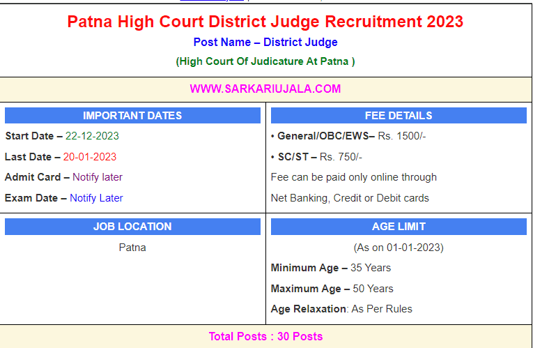 Post Description – PHC Patna High Court is inviting online applications for District Judge for 30 posts. Interested people meet all the eligibility criteria, apply online Details Of Recruitment Of Patna High Court District Judge Online Form 2023Posts Name – District Judge Number Of Posts – 30 Posts Pay Scale – Rs.51550 – 63070/- (Level 5) Education Qualification – Bachelor Degree in Law with Minimum 7 Year Advocate Practice & Minimum 24 Cases Each Year in Last 3 Years will be eligible for this recruitment. How to Apply Online Patna High Court District Judge Online Form 2023 – Candidates can apply through link provided below or they can also apply through official site of the High Court Of Judicature At Patna before 20/January/2024. Required Documents For Online Application – Educational & Other Mark sheet And Certificates Aadhar Card / Pan Card Passport Size Photo Signature Selection Mode – Written Examination Interview Merit List | |||||