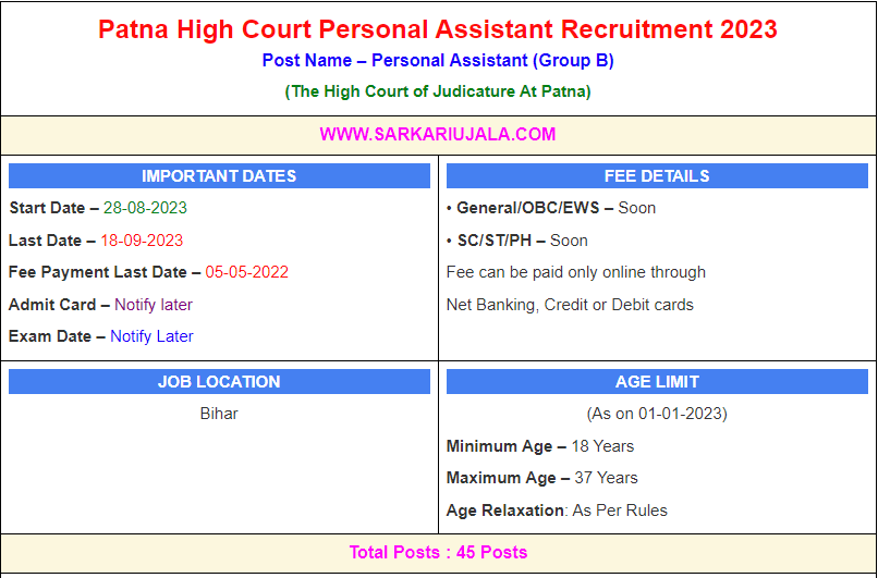 Post Description – The High Court of Judicature At Patna is inviting online applications for Personal Assistant for 36 posts. Interested people meet all the eligibility criteria, apply online Details Of Recruitment Of Patna High Court PA Online Form 2023Posts Name – Personal Assistant Number Of Posts – 36 Posts Pay Scale – Rs.44900 – Rs. 142400/- Education Qualification – Bachelor Degree in Any Stream And 6 Month Computer Diploma / Certificate Course And English Shorthand: 100 WPM and English Typing : 40 WPM How to Apply Online Patna High Court Personal Assistant Online Form 2023 – Candidates can apply through link provided below or they can also apply through official site of the The High Court of Judicature At Patna before 18/September/2023. Required Documents For Online Application – Educational Mark sheet And Certificates Aadhar Card / Pan Card Passport Size Photo Signature Selection Mode – Written Examination Skill Test Final Merit List