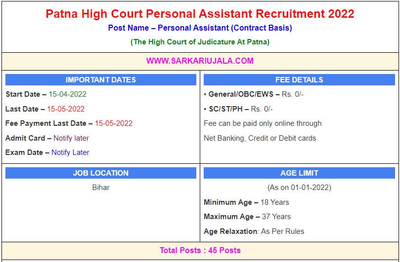 Post Description –The High Court of Judicature At Patna is inviting online applications for Personal Assistant for 45 posts. Interested people meet all the eligibility criteria, apply online Details Of Recruitment Of Patna High Court PA Online Form 2022Posts Name – Personal Assistant Number Of Posts – 45 Posts Pay Scale – Rs.30,000 Per Month Education Qualification – Bachelor Degree in Any Stream And 6 Month Computer Diploma / Certificate Course And English Shorthand: 80 WPM and English Typing : 40 WPM How to Apply Online Patna High Court PA Online Form 2022 – Candidates can apply through link provided below or they can also apply through official site of the The High Court of Judicature At Patna before 15/May/2022. Required Documents For Online Application – Educational Mark sheet And Certificates Aadhar Card / Pan Card Passport Size Photo Signature Selection Mode – Written Examination Skill Test Final Merit List