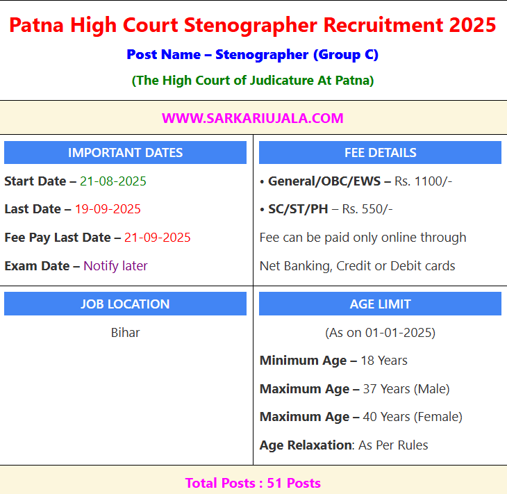 Patna High Court Stenographer Recruitment 2025Post Name – Stenographer (Group C)(The High Court of Judicature At Patna) | |||||