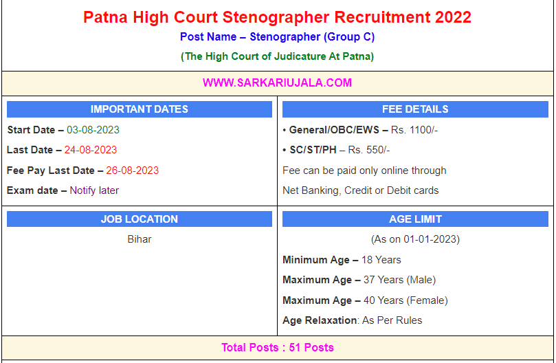 Post Description –The High Court of Judicature At Patna is inviting online applications for Stenographer for 51 posts. Interested people meet all the eligibility criteria, apply online Details Of Recruitment Of Patna High Court Stenographer Online Form 2023Posts Name – Stenographer Number Of Posts – 51 Posts Category Wise Posts – General – 06 Posts BC –08 Posts EBC –15 Posts SC –19 Posts ST – 02 Posts EWS –01 Posts Pay Scale – Rs.25500 – 81100/- (Level 4) Education Qualification – 12 Passed & English Shorthand & Typing Certificate & Basic Computer Certificate Of 6 Month. And English Shorthand 80WPM & English Typing 40 WPM . How to Apply Online Patna HC Stenographer Online Form 2023 – Candidates can apply through link provided below or they can also apply through official site of the The High Court of Judicature At Patna Before 23 August 2023. Required Documents For Online Application – 10th / 12th Mark sheet And Certificates Aadhar Card / Pan Card Passport Size Photo Signature Selection Mode – Written Examination Skill Test Interview Final Merit List