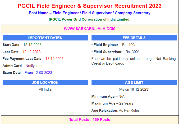 Post Description – PGCIL Power Grid Corporation of India Limited is inviting online applications for Field Engineer / Field Supervisor / Company Secretary for 159 posts. Interested people meet all the eligibility criteria, apply online Details Of Recruitment Of PGCIL Field Engineer & Supervisor Online Form 2023Posts Name – Field Engineer / Field Supervisor / Company Secretary Number Of Posts – 159 Posts Category Wise Posts – Field Engineer (Electrical) – 57 Posts Field Engineer (Civil) – 22 Posts Field Supervisor (Electrical) – 57 Posts Field Supervisor (Civil) – 22 Posts Company Secretary – 01 Posts Pay Scale – As Per Rules Education Qualification – Field Engineer (Electrical) – BE / B.Tech / B.SC Engg Degree in Electrical with 55% Marks and 1 Year Experience. For SC / ST / PH / Candidate Pass Only. Field Engineer (Civil) – BE / B.Tech / B.SC Engg Degree in Civil with 55% Marks and 1 Year Experience. For SC / ST / PH / Candidate Pass Only. Field Supervisor (Electrical) – Diploma in Electrical Engineering with 55% Marks and 1 Year Experience. For SC / ST / PH / Candidate Pass Only. Field Supervisor (Civil) – Diploma in Electrical Civil Engineering with 55% Marks and 1 Year Experience. For SC / ST / PH / Candidate Pass Only. Company Secretary – Associate Member of the Institute of Company Secretaries with 1 Year Experience. How to Apply Online PGCIL Field Engineer & Supervisor Online Form 2023 – Candidates can apply through link provided below or they can also apply through official site of the PGCIL Power Grid Corporation of India Limited before 18/December/2023. Required Documents For Online Application – Educational Mark sheet And Certificates Aadhar Card / Pan Card Passport Size Photo Signature Selection Mode – Written Examination Merit List | |||||