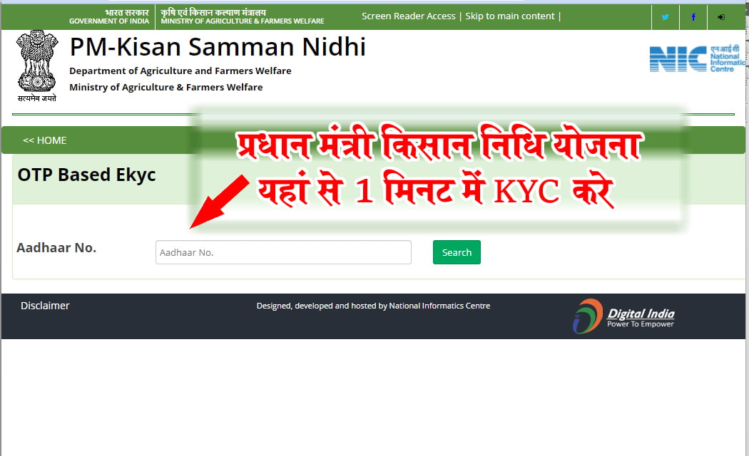 How to Update Online PM E-KYC : 1) Visit the official website of https://pmkisan.gov.in 2) From menu Navigation, click on the option of E-KYC. 3) Enter the Aadhar number And OTP Available in Registered Mobile Number. 4) Enter OTP (One Time Password). 5) If you Enter Correct OTP Than PM Kisan E-KYC will be successfully updated. | |||||