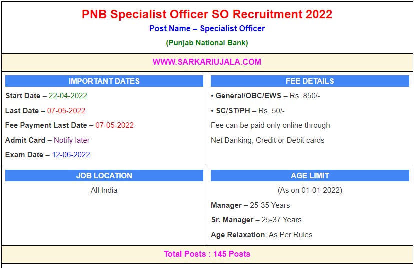 PNB Specialist Officer SO Recruitment 2022Post Name – Specialist Officer(Punjab National Bank) | |||||