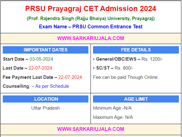 PRSU Prayagraj CET Admission 2024(Prof. Rajendra Singh (Rajju Bhaiya) University, Prayagraj) Exam Name – PRSU Common Entrance Test | |||||