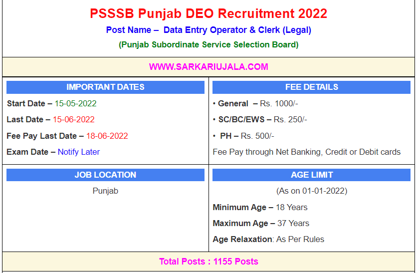 Post Description –PSSSB Punjab Subordinate Service Selection Board is inviting online applications for Data Entry Operator & Clerk for 1155 posts. Interested people meet all the eligibility criteria, apply online Details Of Recruitment Of PSSSB Punjab DEO Online Form 2022Posts Name – Data Entry Operator & Clerk Number Of Posts – 1155 Posts Category Wise Posts – DEO- 917 Posts Clerk (Legal)- 238 Posts Pay Scale – As Per Rules Education Qualification – DEO- Graduate Degree & Computer Course & Typing 30 WPM Clerk (Legal)- Graduate In Law & Computer Course & Typing 30WPM How to Apply Online PSSSB Punjab DEO Online Form 2022 – Candidates can apply through link provided below or they can also apply through official site of the Punjab Subordinate Service Selection Board before 15/June/2022. Required Documents For Online Application – Educational Mark sheet And Certificates Aadhar Card / Pan Card Passport Size Photo Signature Selection Mode – Written Examination Skill Test Final Merit List