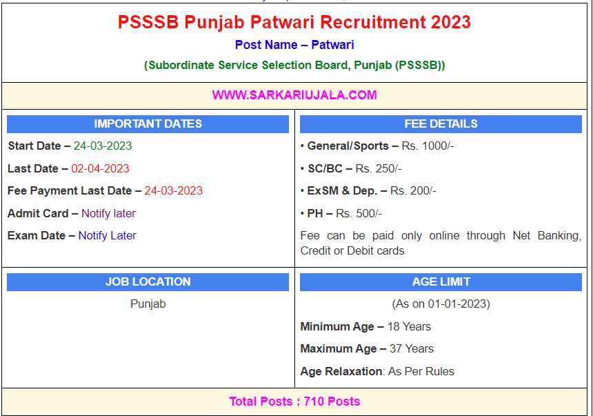 Post DescriptionPSSSB Subordinate Service Selection Board, Punjab (PSSSB) is inviting online applications for Patwari for 710 posts. Interested people meet all the eligibility criteria, apply online