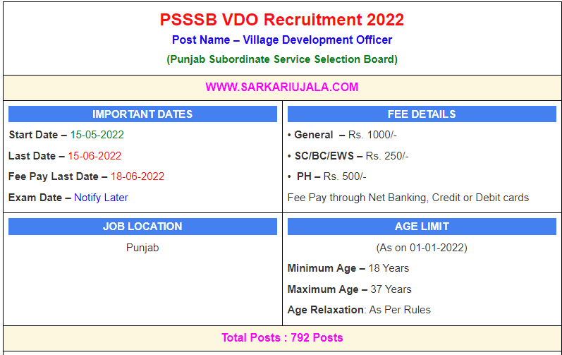 PSSSB VDO Recruitment 2022Post Name – Village Development Officer(Punjab Subordinate Service Selection Board) | |||||