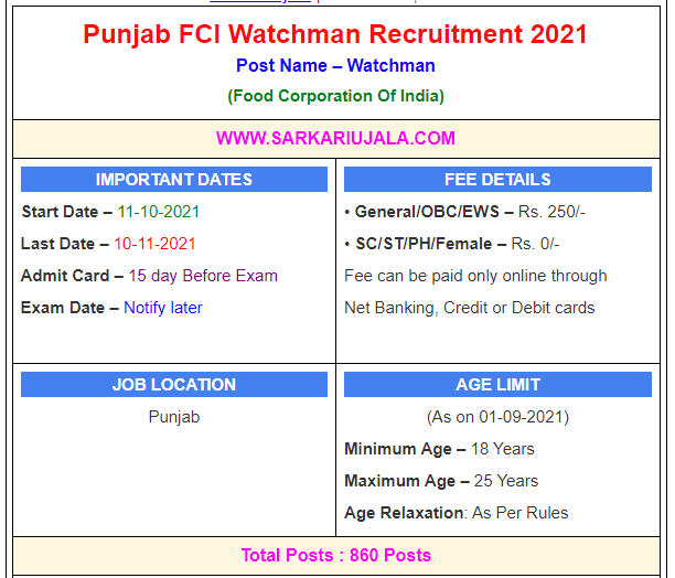 Punjab FCI Watchman Recruitment 2021Post Name – Watchman(Food Corporation Of India) | |||||