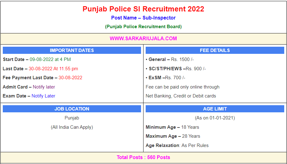 Post Description – Punjab Police Department is inviting online applications for Sub Inspector for 560 posts. Interested people meet all the eligibility criteria, apply online Details Of Recruitment Of Punjab Police SI Online Form 2022Posts Name – Sub Inspector Number Of Posts – 560 Posts Category Wise Posts – District (SI) – 87 Posts Armed Police (SI)– 97 Posts Investigation (SI) – 289 Posts Intelligence (SI) – 87 Posts Pay Scale – Rs . 35400/- (Level 6) Education Qualification – Rest All (SI)- Bachelor Degree Intelligence (SI)- B.Sc/B.Tech/B.E./BCA/PGDCA/NIELIT Physical Standard Height For District & Armed Police (SI) Height: 5’7″ Feet (Male), 5’2″ Feet (Female) Running- 1600 Meter in 7 Minute (Male) ,800 Meter in 5 Minute (Female) Long Jump – 3.65 Meter (Male ) In 3 Chance, 3 Meter In 3 Chance (Female) High Jump – 1.10 Meter (Male ) In 3 Chance, 0.90 Meter In 3 Chance (Female) Height For Intelligence & Investigation – Height: 5’5″ Inch (Male), 5’1″ Inch (Female) Running- 800 Meter in 4 Minute (Male) ,400 Meter in 2Minute (Female) Gola Throw – 7 Kg Gola 19 Feet (Male), 4 KG Gola 15 Feet(Female) Long Jump – 9 Feet (Male ) In 3 Chance, 6 Feet In 3 Chance (Female) High Jump – 3 Feet (Male ) In 3 Chance, 2.5 Feet In 3 Chance (Female) How to Apply Online Punjab Police SI Online Form 2022 – Candidates can apply through link provided below or they can also apply through official site of the Punjab Police Recruitment Board before 30/August/2022. Required Documents For Online Application – Educational Mark sheet And Certificates Aadhar Card / Pan Card Passport Size Photo Signature Selection Mode – Written Examination PET/PST Final Merit List