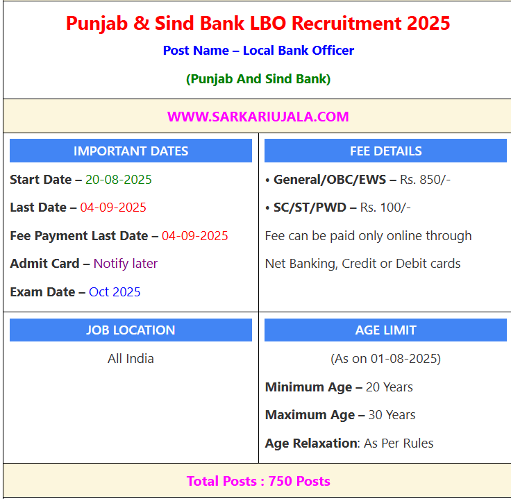 Post Description – Punjab & Sind Bank is Inviting Online Application Form For Local Bank Officers (LBO) in 2025 For 750 Posts. The application starts on 20 August 2025, and the last date to apply and pay the fee is 04 September 2025. Exam and admit card dates will be announced later. For more details, visit moneyujala.com. Details Of Recruitment Of Punjab & Sind Bank LBO Online Form 2025 Posts Name – Local Bank Officer Number Of Posts – 750 Posts Category Wise Posts – Andhra Pradesh – 80 Posts Chhattisgarh– 40 Posts Gujarat– 100 Posts Himachal Pradesh – 30 Posts Jharkhand – 35 Posts Karnataka– 65 Posts Maharashtra – 100 Posts Odisha – 85 Posts Pondicherry – 5 Posts Punjab – 60 Posts Tamil Nadu – 85 Posts Telangana – 50 Posts Assam – 15 Posts Pay Scale – As Per Rules Education Qualification – Graduate Degree From Any Board And Knowledge of Local Language And 18 Month Experience in Officer Cadre in any Public Sector Bank/Regional Rural Bank How to Apply Online Punjab & Sind Bank LBO Online Form 2025 – Candidates can apply through link provided below or they can also apply through official site of the Punjab and Sind Bank before 04/September/2025. Required Documents For Online Application – Educational Mark sheet And Certificates Aadhar Card / Pan Card Passport Size Photo Signature Selection Mode – Written Exam Interview DV Test Merit List | |||||