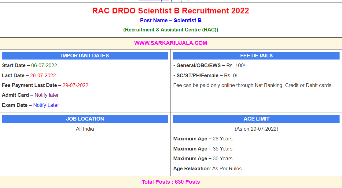 Post Description – Recruitment & Assistant Centre (RAC) DRDO is inviting online applications for Scientist B for 630 posts. Interested people meet all the eligibility criteria, apply online Details Of Recruitment Of RAC DRDO Scientist B Online Form 2022Posts Name – Scientist B Number Of Posts – 630 Posts Category Wise Posts – DRDO – 579 Posts ADA – 43 Posts DST – 08 Posts Pay Scale – As Per Rules Education Qualification – BE / B.Tech Engineering Degree in Related Trade with First Division Marks with GATE Exam Score Card. Note- Read Official Notification Before Form Apply How to Apply Online RAC DRDO Scientist B Online Form 2022 – Candidates can apply through link provided below or they can also apply through official site of the Recruitment & Assistant Centre before 29/July/2022. Required Documents For Online Application – Educational Mark sheet And Certificates Aadhar Card / Pan Card Passport Size Photo Signature Selection Mode – Written Examination Final Merit List