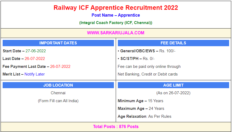 Post Description – Integral Coach Factory (ICF, Chennai) is inviting online applications for Apprentice for 876 posts. Interested people meet all the eligibility criteria, apply online Details Of Recruitment Of Railway ICF Apprentice Online Form 2022Posts Name – Apprentice Number Of Posts – 876 Posts Category Wise Posts – Freshers – 276 Posts Carpenter – 37 Posts Electrician – 32 Posts Fitter – 65 Posts Machinist – 34 Posts Painter – 33 Posts Welder – 75 Posts Pasaa – 0 Posts Ex-ITI – 600 Posts Carpenter – 50 Posts Electrician – 156 Posts Fitter – 143 Posts Machinist – 29 Posts Painter – 50 Posts Welder – 170 Posts Pasaa – 02 Posts STIPEND – Freshers- Rs. 6000/- Per Month Ex ITI- Rs. 7000/- Per Month Education Qualification – Freshers- 10th Passed with 50% Marks And Science / Math as a Subject in 10+2 Level. Ex ITI- 10th Passed with 50% Marks And ITI Certificate How to Apply Online Railway ICF Apprentice Online Form 2022 – Candidates can apply through link provided below or they can also apply through official site of the Integral Coach Factory before 26/July/2022. Required Documents For Online Application – 10th / 12th/ITI Mark sheet And Certificates Aadhar Card / Pan Card Passport Size Photo Signature Selection Mode – Final Merit List