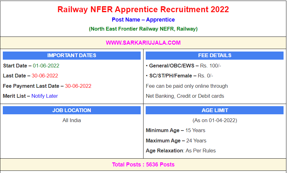 Post Description – NEFR North East Frontier Railway NEFR, Railway is inviting online applications for Apprentice for 5636 posts. Interested people meet all the eligibility criteria, apply online Details Of Recruitment Of Railway NFER Apprentice Online Form 2022Posts Name – Apprentice Number Of Posts – 5636 Posts Category Wise Posts – Katihar (Kir)& Tdh Workshop – 919 Posts Alipurduar (APDJ) – 522 Posts Rangiya (RNY) – 551 Posts Lumding (LMG), S&T/workshop/ MLG (PNO) & Track Machine/MLG – 1140 Posts Tinsukia (TSK) – 547 Posts New Bongaigaon Workshop (NBQS) & EWS/BNGN – 1110 Posts Dibrugarh Workshop (DBWS) – 847 Posts Stipend – As Per Rules Education Qualification – 10th Passed And ITI Certificate How to Apply Online Railway NFER Apprentice Online Form 2022 – Candidates can apply through link provided below or they can also apply through official site of the North East Frontier Railway NEFR, Railway before 30/June/2022. Required Documents For Online Application – 10th / ITI Mark sheet And Certificates Aadhar Card / Pan Card Passport Size Photo Signature Selection Mode – Final Merit List