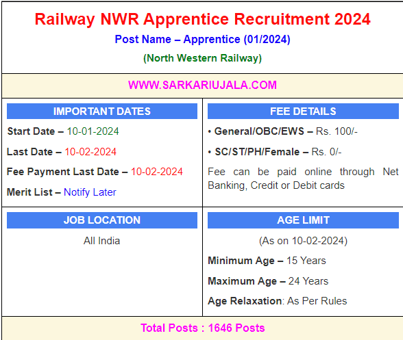 Railway NWR Apprentice Recruitment 2024Post Name – Apprentice (01/2024)(North Western Railway) | |||||