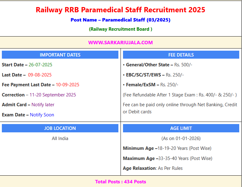 Post Description – RRB Railway Recruitment Board is inviting online applications for Paramedical Staff for 434 posts. Interested people meet all the eligibility criteria, apply online Details Of Recruitment Of RRB Railway Paramedical Staff Online Form 2024Posts Name – Paramedical Staff Number Of Posts – 434 Posts Categories Wise Posts – Nursing Superitendent- 272 Posts Dialysis Technician- 04 Posts Health And Malaria Inspector- 33 Posts Pharmacist (Entry Grade)- 105 Posts Radiographer X-Ray Technician- 04 Posts ECG Technician- 04 Posts Laboratory Assistant Grade II – 12 Posts Pay Scale – As Per Rules Educational Qualification – Nursing Superitendent– GNM / B.Sc Nursing. Dialysis Technician– B.Sc. and Diploma in Hemodialysis. Health And Malaria Inspector– B.Sc. with Chemistry, 01 Year Diploma in Health / Sanitary Inspector. Pharmacist (Entry Grade)– Degree / Diploma in Pharmacy. Radiographer X-Ray Technician– Diploma in Radiography / X Ray Technician / Radiodiagnosis Technology. ECG Technician– Degree / Diploma in ECG Laboratory Technology / Cardiology / Cardiology Technician / Cardiology Techniques. Laboratory Assistant Grade II – Diploma in Medical Laboratory Technology (DMLT). How to Apply Online RRB Railway Paramedical Staff Online Form 2025– Candidates can apply through link provided below or they can also apply through official site of the Railway Recruitment Board before 08 September 2025. Required Documents For Online Application – Educational Marksheet And Certificates Aadhar Card / Pan Card Passport Size Photo Signature Selection Mode – CBT Exam Skill Test Merit List | |||||
