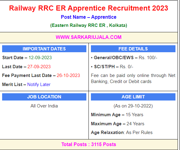 Post Description – RRC Railway Recruitment Cell is inviting online applications for Apprentice for 3115 posts. Interested people meet all the eligibility criteria, apply online Details Of Recruitment Of Railway RRC ER Apprentice Online Form 2023Posts Name – Apprentice Number Of Posts – 3115 Posts Category Wise Posts – Howrah Division- 659 Posts Liluah Workshop- 612 Posts Sealdah Division- 440 Posts Kanchrapara Workshop- 187 Posts Malda Division- 138 Posts Asansol Workshop- 412 Posts Jamalpur Workshop – 667 Posts STIPEND – As Per Rules Education Qualification – 10 Passed And ITI / NCVT Certificate in Related Trade. How to Apply Online Railway RRC ER Apprentice Online Form 2023– Candidates can apply through link provided below or they can also apply through official site of the Railway Recruitment Cell before 26/October/2023. Required Documents For Online Application – Educational Mark sheet And Certificates Aadhar Card / Pan Card Passport Size Photo Signature Selection Mode – Written Exam Merit List