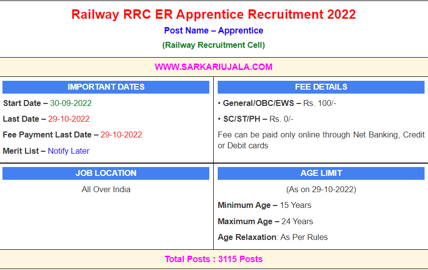Post Description – RRC Railway Recruitment Cell is inviting online applications for Apprentice for 3115 posts. Interested people meet all the eligibility criteria, apply online Details Of Recruitment Of Railway RRC ER Apprentice Online Form 2022Posts Name – Apprentice Number Of Posts – 3115 Posts Category Wise Posts – Howrah Division- 659 Posts Liluah Workshop- 612 Posts Sealdah Division- 440 Posts Kanchrapara Workshop- 187 Posts Malda Division- 138 Posts Asansol Workshop- 412 Posts Jamalpur Workshop – 667 Posts STIPEND – As Per Rules Education Qualification – 10 Passed And ITI / NCVT Certificate in Related Trade. How to Apply Online Railway RRC ER Apprentice Online Form 2022– Candidates can apply through link provided below or they can also apply through official site of the Railway Recruitment Cell before 29/Oct/2022. Required Documents For Online Application – Educational Mark sheet And Certificates Aadhar Card / Pan Card Passport Size Photo Signature Selection Mode – Written Examination Merit List