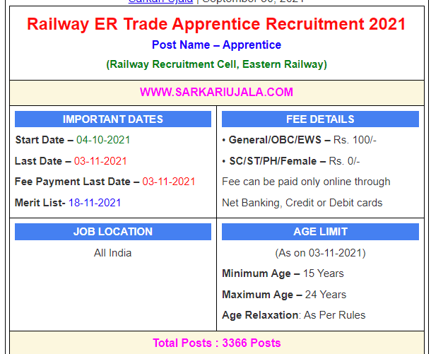 Post Description –Railway Recruitment Cell, Eastern Railway is inviting online applications for Apprentice for 3366 posts. Interested people meet all the eligibility criteria, apply online Details Of Recruitment Of Railway RRC ER Trade Apprentice Online Form 2021Posts Name – Apprentice Number Of Posts – 3366 Posts Division Wise Posts – Howrah Division – 659 Posts Sealdah Division – 1123 Posts Malda Division – 100 Posts Asansol Division – 412 Posts Kanchrapara workshop – 190 Posts Liluah Workshop – 204 Posts Jamalpur Workshop – 678 Posts Category Wise Posts – General – 1378 Posts OBC – 906 Posts SC – 499 Posts ST – 249 Posts EWS – 334 Posts Education Qualification – 10th Passed With 50% Marks & ITI Relevant Trade. How to Apply Online Railway RRC ER Trade Apprentice Online Form 2021 – Candidates can apply through link provided below or they can also apply through official site of the Railway Recruitment Cell before 03/Nov/2021. Required Documents For Online Application – 10th & ITI Mark sheet And Certificates Aadhar Card / Pan Card Passport Size Photo Signature Selection Mode – Final Merit List