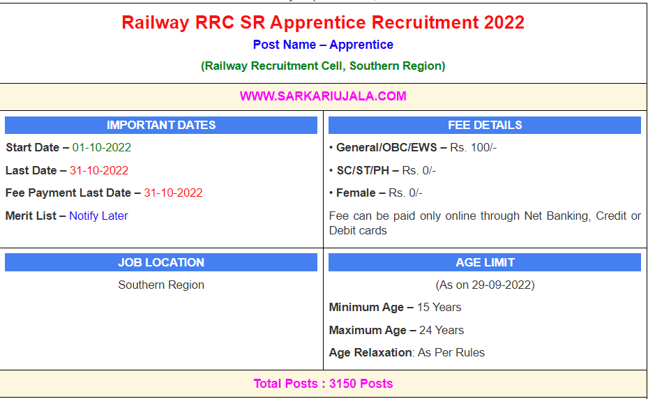 Post Description – RRC Railway Recruitment Cell , Southern Region is inviting online applications for Apprentice for 3150 posts. Interested people meet all the eligibility criteria, apply online Details Of Recruitment Of Railway RRC SR Apprentice Online Form 2022Posts Name – Apprentice Number Of Posts – 3150 Posts Category Wise Posts – Fresher Candidates- 130 Posts Carriage Work, Perambur- 110 Posts Signal & Telecommunication Workshop / Podanur- 20 Posts ITI Candidates – 527 Posts Central Workshop, Golden Rock- 527 Posts Ex-ITI Candidates – 2494 Posts Carriage Work, Perambur – 1233 Posts Signal & Telecommunication Workshop / Podanur- 1261 Posts STIPEND – As Per Rules Education Qualification – Fresher Candidates– 10th /12th Passed with Minimum 50% Marks. Ex-ITI/ITI Candidate – 10th Passed with ITI / NCVT Certificate in Related Trade Note- Must Read Official Notification Before Apply Form. How to Apply Online Railway Railway RRC SR Apprentice Online Form 2022– Candidates can apply through link provided below or they can also apply through official site of the Railway Recruitment Cell, Southern Region before 31/Oct/2022. Required Documents For Online Application – Educational Mark sheet And Certificates Aadhar Card / Pan Card Passport Size Photo Signature Selection Mode – Written Examination Merit List