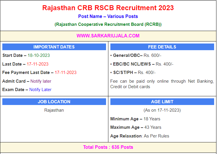 Post Description – RSMSSB Rajasthan Staff Selection Board, Jaipur is inviting online applications for Various Posts for 635 posts. Interested people meet all the eligibility criteria, apply online Details Of Recruitment Of Rajasthan CRB RSCB Online Form 2023Posts Name –Various Posts Number Of Posts – 635 Posts Category Wise Posts – Senior Manager- 01 Posts Manager- 89 Posts Computer Programmer- 05 Posts Banking Assistant- 540 Posts Pay Scale – As Per Rules Education Qualification – Senior Manager– MBA degree Or Two years‘ Post Graduate Diploma in Business Management with Graduation in any subject or an equivalent degree recognized by the State Government. And Knowledge of Computer is compulsory. Manager– Graduate Knowledge of Computer is compulsory Computer Programmer– Degree in Computer/ B.Tech/ MCA/ M.Sc. (CS/ IT) And 1 Years Experience. Banking Assistant– Graduate degree recognized University. AND Knowledge of Computer is compulsory How to Apply Online Rajasthan CRB RSCB Online Form 2023 – Candidates can apply through link provided below or they can also apply through official site of the Rajasthan Staff Selection Board, Jaipur before 11/November/2023. Required Documents For Online Application – Educational Mark sheet And Certificates Aadhar Card / Pan Card Passport Size Photo Signature Selection Mode – Written Exam | |||||