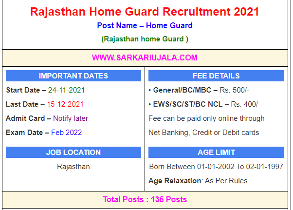 Post DescriptionRajasthan home Guard is inviting online applications for Home Guard for 135 posts. Interested people meet all the eligibility criteria, apply online