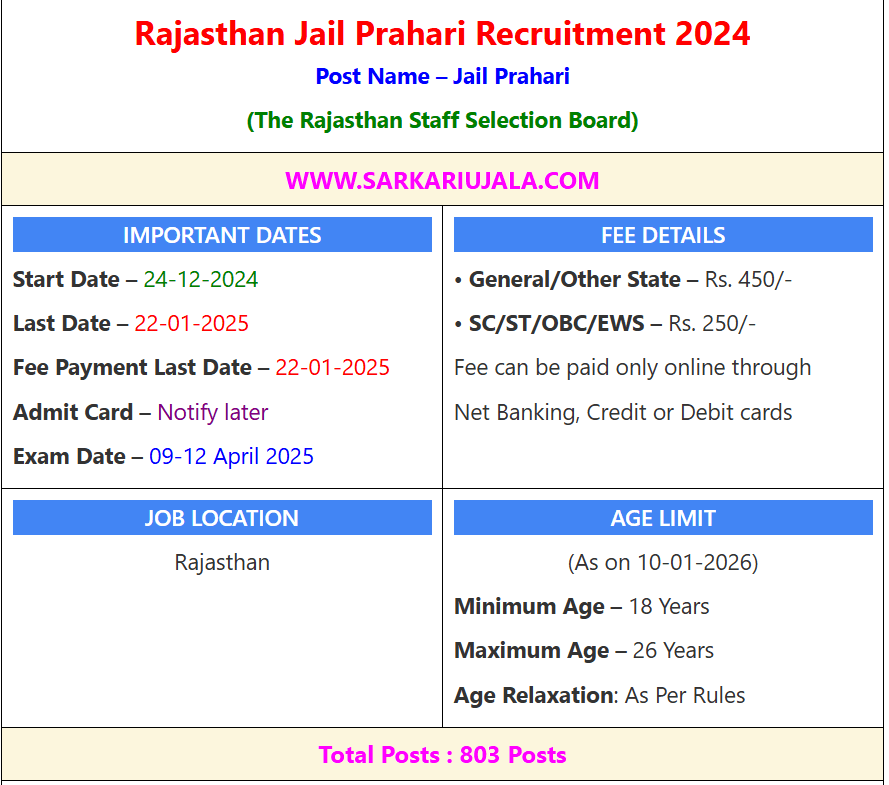 Post Description – The Rajasthan Staff Selection Board is recruiting for the position of Jail Prahari in 2024. The application process starts on December 24, 2024, and ends on January 22, 2025, which is also the last date for fee payment. The exam is scheduled to take place from April 9 to April 12, 2025. The admit card details will be notified later. The application fee is Rs. 450 for General/Other State candidates and Rs. 250 for SC/ST/OBC/EWS candidates, payable online through Net Banking, Credit, or Debit cards. The job location is in Rajasthan. Applicants must be between 18 and 26 years old as of January 10, 2026, with age relaxation as per rules. There are a total of 803 posts available for this recruitment. For more details, visit Sarkari Ujala. Details Of Recruitment Of Rajasthan Jail Prahari Online Form 2024 Posts Name – Jail Prahari Number Of Posts – 803 Posts Category Wise Posts – TSP Area – 44 Posts Non TSP Area – 759 Posts Pay Scale – As Per Rules Education Qualification – 10th Passed From A Recognized Board. Race – 5 Km In 25 Minutes (Male) & 5 KM 35 Minute (Female) How to Apply Online Rajasthan Jail Prahari Online Form 2024 – Candidates can apply through link provided below or they can also apply through official site of the Rajasthan Staff Selection Board before 22/January/2025. Required Documents For Online Application – 10th / 12th Mark sheet And Certificates Aadhar Card / Pan Card Passport Size Photo Signature Selection Mode – Written Exam PET/PST Medical Final Merit List | |||||