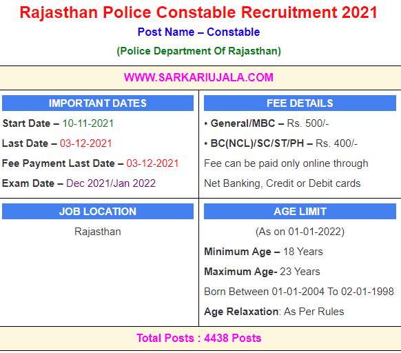 Post Description –Police Department Of Rajasthan is inviting online applications for Police Constable for 4438 posts. Interested people meet all the eligibility criteria, apply online Details Of Recruitment Of Rajasthan Police Constable Online Form 2021Posts Name – Police Constable Number Of Posts – 4438 Posts Category Wise Posts – For NON-TSP Area General- 1919 Posts OBC-506 Posts SC-358 Posts ST-168 Posts MBC-325 Posts EWS- 491 Posts For TSP Area General- 1919 Posts OBC-00 Posts SC-05 Posts ST-277 Posts MBC-00 Posts EWS- 00 Posts Posts Wise Seats – For NON-TSP Area Constable (GD) – 398 Posts Telecommunication – 154 Posts Driver – 68 Posts For TSP Area Constable (GD) – 625 Posts Driver – 32 Posts Band – 23 Posts Pay Scale – Pay Matrix Level 5 Education Qualification – Constable (GD)- 12th Passed From A Recognized Board. Constable (Driver)- 12th Passed With 1 Years Old LMV/HMV Driving License Constable (RAC/BAND)- 10th Passed From A Recognized Board. Constable (Tele. Comm.)- 12th Passed With Science (Physics, Math) Physical Standard Height & Chest For General/OBC Height: 168 cm (Male), 152Cm (Female) Chest : 81cm -86 Cm Height & Chest For SC/ST– Height: 163 cm (Male), 152Cm (Female) Chest – 76cm – 81 cm Running- 05 KM in 25 Minute (Male) ,05 KM in 35 Minute (Female) How to Apply Online Rajasthan Police Constable Online Form 2021– Candidates can apply through link provided below or they can also apply through official site of the Police Department Of Rajasthan before 03/Dec/2021. Required Documents For Online Application – 10th / 12th Mark sheet And Certificates Aadhar Card / Pan Card Passport Size Photo Signature Selection Mode – Written Examination PET/PST Medical test Final Merit List