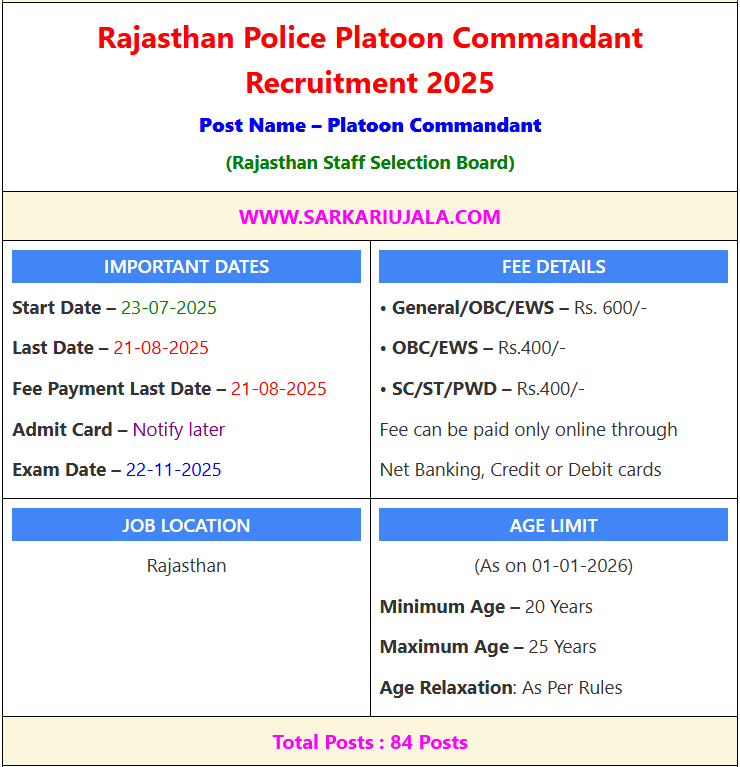 Post DescriptionThe Rajasthan Staff Selection Board is inviting online applications for the post of Platoon Commandant , with a total of 84 posts available.  Eligible candidates who meet the criteria can apply online.