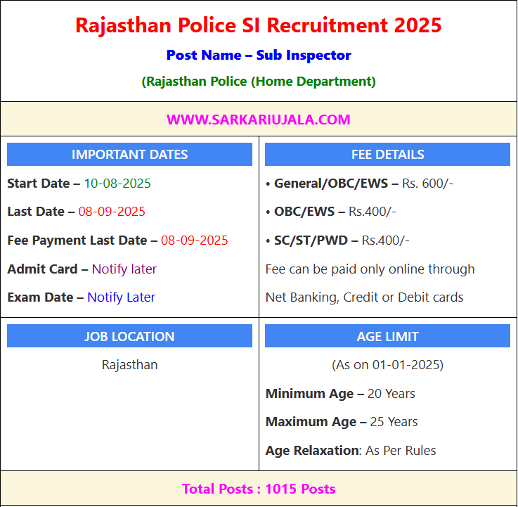 Post Description – The Rajasthan Police Department invites online applications for the post of Sub Inspector , with a total of 1015 posts available. Eligible candidates who meet the criteria can apply online. Details Of Recruitment Of Rajasthan Police SI Online Form 2025Posts Name – Sub Inspector Number Of Posts – 1015 Posts Category Wise Posts – Sub Inspector (AP) – 896 Posts Sub Inspector (AP) – Sahariya – 04 Posts Sub Inspector (AP)- TSP – 25 Posts Sub Inspector (IB) – 26 Posts Platoon Commander (RAC) – 64 Posts Pay Scale – As Per Rules Education Qualification – Bachelor Degree & Knowledge of Rajasthani Culture. How to Apply Online Rajasthan Sub Inspector Online Form 2025 – Candidates can apply through link provided below or they can also apply through official site of the The Rajasthan Police (Home Department) before 08/September/2025. Required Documents For Online Application – Educational Mark sheet And Certificates Aadhar Card / Pan Card Passport Size Photo Signature | |||||