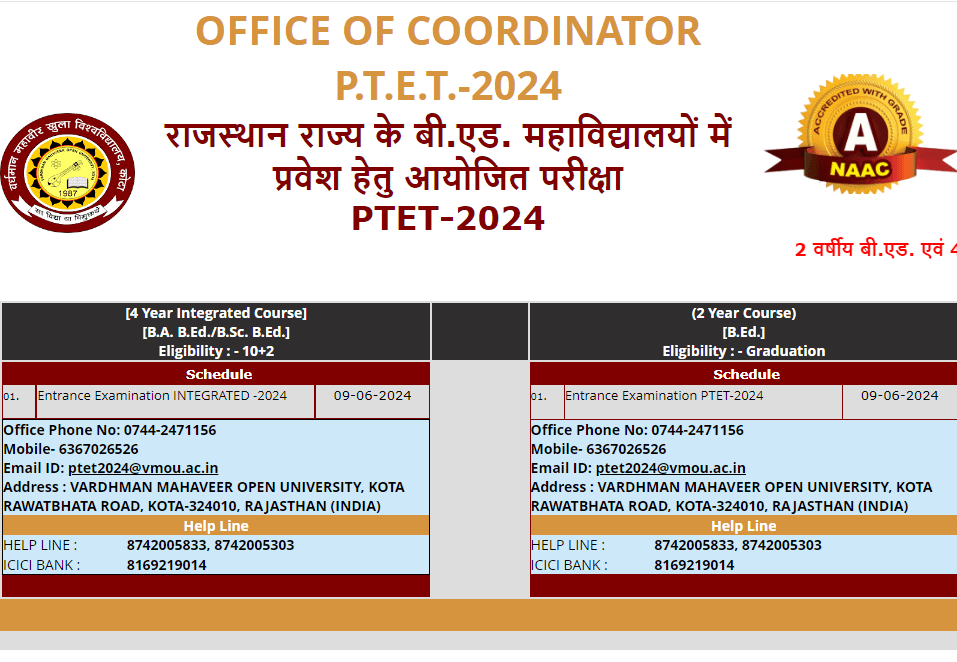 Rajasthan PTET Admit Card 2024(Vardhman Mahaveer Open University, Kota) Exam Name – Pre Teacher Education Test | |||||