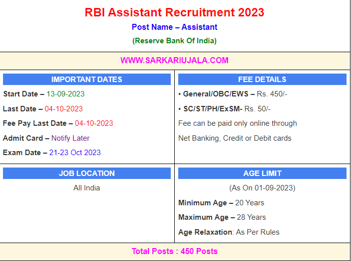 Post Description – RBI Reserve Bank Of India RBI is inviting online applications for Assistant for 450 posts. Interested people meet all the eligibility criteria, apply online Details Of Recruitment Of RBI Assistant Online Form 2023Posts Name – Assistant Number Of Posts – 450 Posts Category Wise Posts – General – 241 Posts OBC – 71 Posts SC – 45 Posts ST – 56 Posts EWS – 37 Posts Pay Scale – Rs.14,650 – 36,091/- Education Qualification – Bachelor Degree With 50% marks ( Only Passed For SC/ST/PWD) How to Apply Online RBI Assistant Online Form 2023 – Candidates can apply through link provided below or they can also apply through official site of the Reserve Bank Of India before 04/October/2023. Required Documents For Online Application – Educational Mark sheet And Certificates Aadhar Card / Pan Card Passport Size Photo Signature Selection Mode – Pre & Mains Exam Merit List