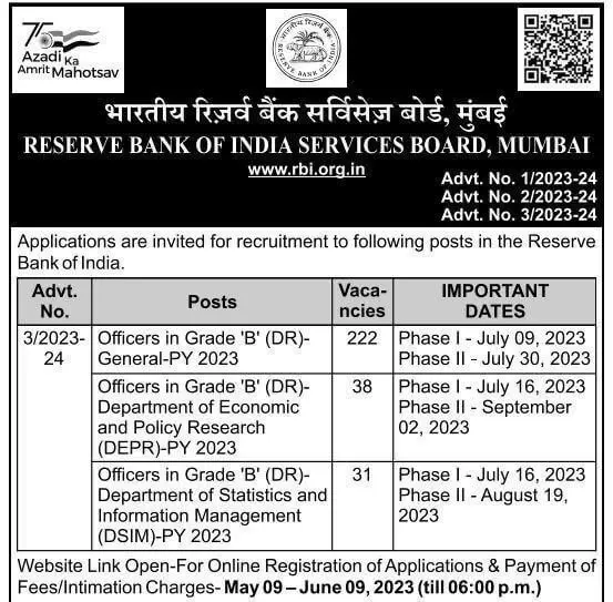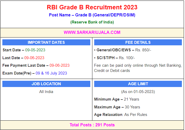 Post Description – RBI Reserve Bank of India is inviting online applications for Grade B Officer for 291 posts. Interested people meet all the eligibility criteria, apply online Details Of Recruitment Of RBI Grade B Online Form 2023Posts Name – Grade B (General/DEPR/DSIM) Number Of Posts – 291 Posts Category Wise Posts – Grade B (General) – 222 Posts Grade B (DEPR)– 38 Posts Grade B (DSIM)– 31 Posts Pay Scale – As Per Rules Education Qualification – Grade B (General)– Graduate (with 60% Marks) or PG (with 55% Marks) Grade B (DEPR)-PG in Economics/ PGDM/ MBA Finance Grade B (DSIM)- PG in Maths/ Statistics How to Apply Online RBI Grade B Online Form 2023 – Candidates can apply through link provided below or they can also apply through official site of the Reserve Bank of India before 09/June/2023. Required Documents For Online Application – Educational Mark sheet And Certificates Aadhar Card / Pan Card Passport Size Photo Signature Selection Mode – Written Exam Main s Exam Interview Merit List