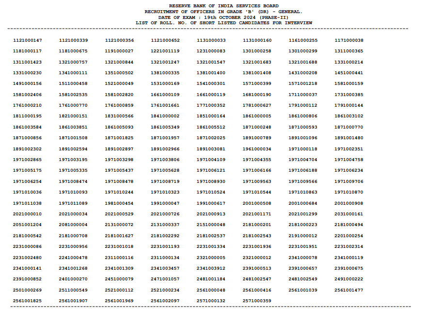 IMPORTANT DATESExam Date(General) Phase I – 08-09-2024 Exam Date(DEPR) Phase I – 14-09-2024 Exam Date(General) Phase II – 19-10-2024 Exam Date(DEPR) Phase II & III – 26-10-2024 Admit Card – 29-08-2024 Result Date – 20-09-2024 Marks- 01-10-2024 Phase II Admit Card – 13-10-2024 Phase II Result – 14-11-2024 Final Result – 12-02-2025 | VACANCY DETAILSExam Name – RBI Grade B Recruitment 2024 Total Vacancy- 94 Posts | ||||