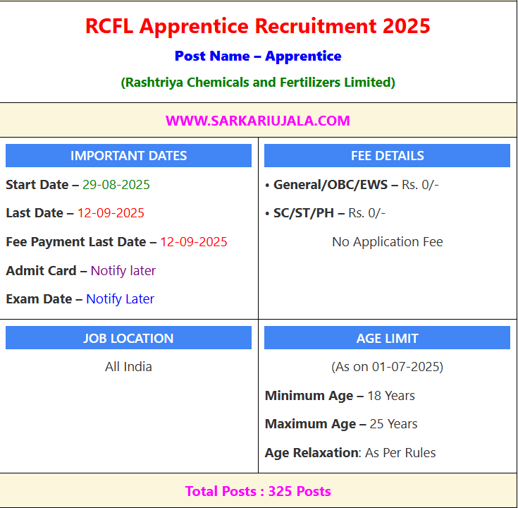 Post Description – RCFL Rashtriya Chemicals And Fertilizers Limited Is Inviting Online Application Form For Apprentice Posts For 325 Posts . Eligible Candidates Can Apply Online Form. Details Of Recruitment Of RCFL Apprentice Online Form 2025Posts Name – Apprentice Number Of Posts – 325 Posts Category Wise Posts – Graduate Apprentice – Accounts Executive – 35 Posts Secretarial Assistant – 50 Posts Recruitment Executive(HR) – 30 Posts Technical Apprentice – 114 Posts Trade Apprentice – 96 Posts STIPEND – As Per Rules Education Qualification – Graduate Apprentice – Accounts Executive – B.Com, BBA/Graduation with Economics , Basic English and Computer operation knowledge is essential Other Post – Any Graduate, Basic English and Computer operation knowledge is essential Recruitment Executive (HR)– Any Graduate, Basic English and Computer operation knowledge is essential Technician Apprentices – 3 Year Engineering Diploma in Chemical / Civil / Computer / Electrical / Instrumentation / Mechanical Engineering. Trade Apprentices – 10+2 Passed With Science OR B.SC Degree. How to Apply Online RCF Various Apprentice Online Form 2025 – Candidates can apply through link provided below or they can also apply through official site of the Rashtriya Chemicals and Fertilizers Limited before 12/September/2025. Required Documents For Online Application – 10th & ITI Mark sheet And Certificates Aadhar Card / Pan Card Passport Size Photo Signature Selection Mode – Merit List