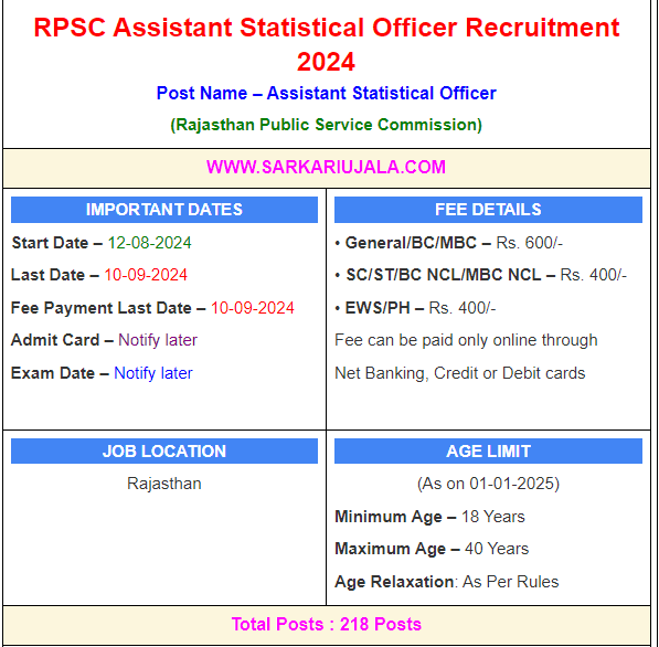 Post Description – Rajasthan Public Service Commission is inviting online applications for Assistant Statistical Officer for 218 posts. Interested people meet all the eligibility criteria, apply online Details Of Recruitment Of RPSC ASO Assistant Statistical Officer Online Form 2024Posts Name – Assistant Statistical Officer Number Of Posts – 43 Posts Category Wise Posts – NON-TSP Area- 31 Posts General – 14 Posts OBC – 06 Posts MBC – 10 Posts SC – 03 Posts ST – 03 Posts EWS – 03 Posts For TSP Area- 12 Posts General – 1 Posts OBC – 0 Posts MBC – 0 Posts SC – 11 Posts ST – 0 Posts Pay Scale – Pay Matrix Level 11 Education Qualification – Master Degree Degree in Maths/ Statistics/ Economics/ Commerce And Computer Course How to Apply Online RPSC ASO Assistant Statistical Officer Online Form 2024 – Candidates can apply through link provided below or they can also apply through official site of the Rajasthan Public Service Commission before 10/September/2024. Required Documents For Online Application – Educational Mark sheet And Certificates Aadhar Card / Pan Card Passport Size Photo Signature Selection Mode – Written/Interview Final Merit List | |||||