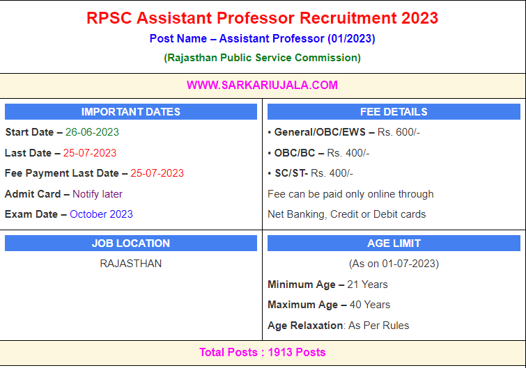 Post Description – RPSC Rajasthan Public Service Commission is inviting online applications for Assistant Professor for 1913 posts. Interested people meet all the eligibility criteria, apply online Details Of Recruitment Of RPSC Assistant Professor Online Form 2023Posts Name – Assistant Professor Number Of Posts – 1913 Posts Subject Wise Posts – Botany -70 Posts Chemistry – 81 Posts Math – 53 Posts Physics – 60 Posts Zoology – 64 Posts ABST –86 Posts Business Administration -71 Posts EAFM –70 Posts Geology –06 Posts Law –25 Posts Economics – 103 Posts English –153 Posts Geography –150 Posts Hindi –214 Posts History –177 Posts Sociology –80 Posts Philosophy – 11 Posts Political Science –181 Posts Public Administration – 45 Posts Sanskrit – 76 Posts Urdu – 24 Posts Punjabi –01 Posts Library Science –01 Posts Psychology –10 Posts Rajasthani –06 Posts Sindhi – 03 Posts Jainology –01 Posts Garment Production and Export Management –01 Posts Military Science –01 Posts Art History –02 Posts Musicology –02 Posts Drawing and Painting –35 Posts Music Vocal –12 Posts Music Instrument –04 Posts Applied Art –05 Posts Painting –05 Posts Sculpture – 04 Posts Music Tabla –02 Posts Music Violin –02 Posts Agriculture Entomology –01 Posts Agriculture Animal Husbandry and Dairy Science –02 Posts Agriculture Agronomy -03 Posts Agriculture Economics –01 Posts Agriculture Engineering –01 Posts Agriculture Horticulture – 03 Posts Agriculture Live Stock – 01 Posts Agriculture Plant Pathology –02 Posts Agriculture Soil Science –02 Posts Pay Scale – Rs.15600 – 39100/- Education Qualification – Master Degree with 55% Marks in Related Subject with NET / SLET / SET OR PHd. Note : For More Eligibility Details Read Notification. How to Apply Online RPSC Assistant Professor Online Form 2023– Candidates can apply through link provided below or they can also apply through official site of the Rajasthan Public Service Commission before 25/July/2023. Required Documents For Online Application – Educational Mark sheet And Certificates Aadhar Card / Pan Card Passport Size Photo Signature Selection Mode – Written Exam Interview Merit List