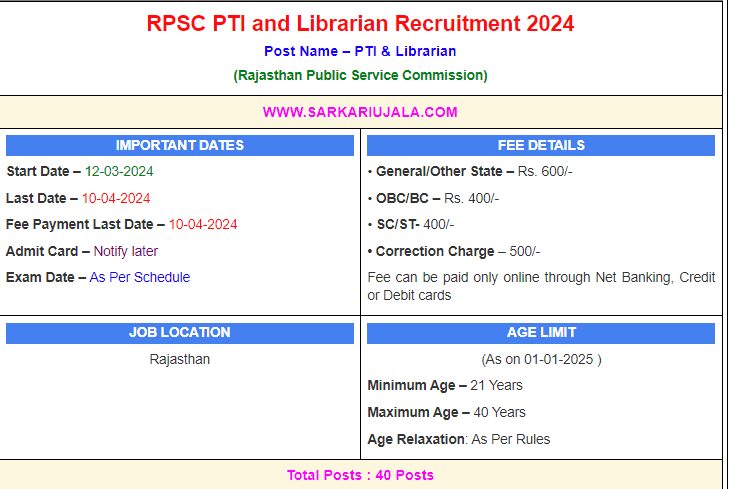RPSC PTI and Librarian Recruitment 2024Post Name – PTI & Librarian(Rajasthan Public Service Commission) | |||||
