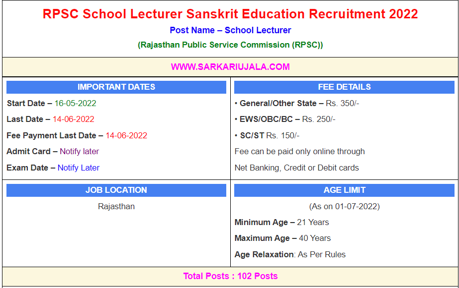 Post Description –RPSC Rajasthan Public Service Commission is inviting online applications for School Lecturer for 102 posts. Interested people meet all the eligibility criteria, apply online Details Of Recruitment Of RPSC School Lecturer Sanskrit Education Online Form 2022Posts Name – School Lecturer Number Of Posts – 102 Posts Category Wise Posts – Hindi – 28 Posts English – 26 Posts General Grammar – 25 Posts Literature – 21 Posts Grammar – 02 Posts Pay Scale – Pay Matrix Level-12 Education Qualification – Master Degree in Related Subject with Minimum 48% Marks and Shiksha Shatri / B.Ed Degree. How to Apply Online RPSC School Lecturer Sanskrit Education Online Form 2022 – Candidates can apply through link provided below or they can also apply through official site of the Rajasthan Public Service Commission before 14/June/2022. Required Documents For Online Application – Educational Mark sheet And Certificates Aadhar Card / Pan Card Passport Size Photo Signature Selection Mode – Written Examination Interview Final Merit List