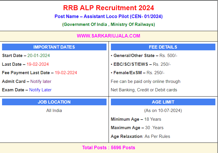 Post Description – Government Of India , Ministry Of Railways is inviting online applications for Assistant Loco Pilot for 5696 posts. Interested people meet all the eligibility criteria, apply online Details Of Recruitment Of RRB ALP Assistant Loco Pilot Online Form 2024Posts Name – Assistant Loco Pilot Number Of Posts – 5696 Posts Category Wise Posts – General – 2499 Posts OBC – 1351 Posts SC – 804 Posts ST – 482 posts EWS – 560 Posts ExSM- 572 Posts Pay Scale – Level 2 Education Qualification – 10th Passed And ITI / Apprenticeship / Diploma / Engineering Degree . How to Apply Online RRB ALP Assistant Loco Pilot Online Form 2024 – Candidates can apply through link provided below or they can also apply through official site of the Ministry Of Railways before 19/February/2024. Required Documents For Online Application – Educational Marksheet And Certificates Aadhar Card / Pan Card Passport Size Photo Signature Selection Mode – Written Exam Skill Test Medical Final Merit List | |||||