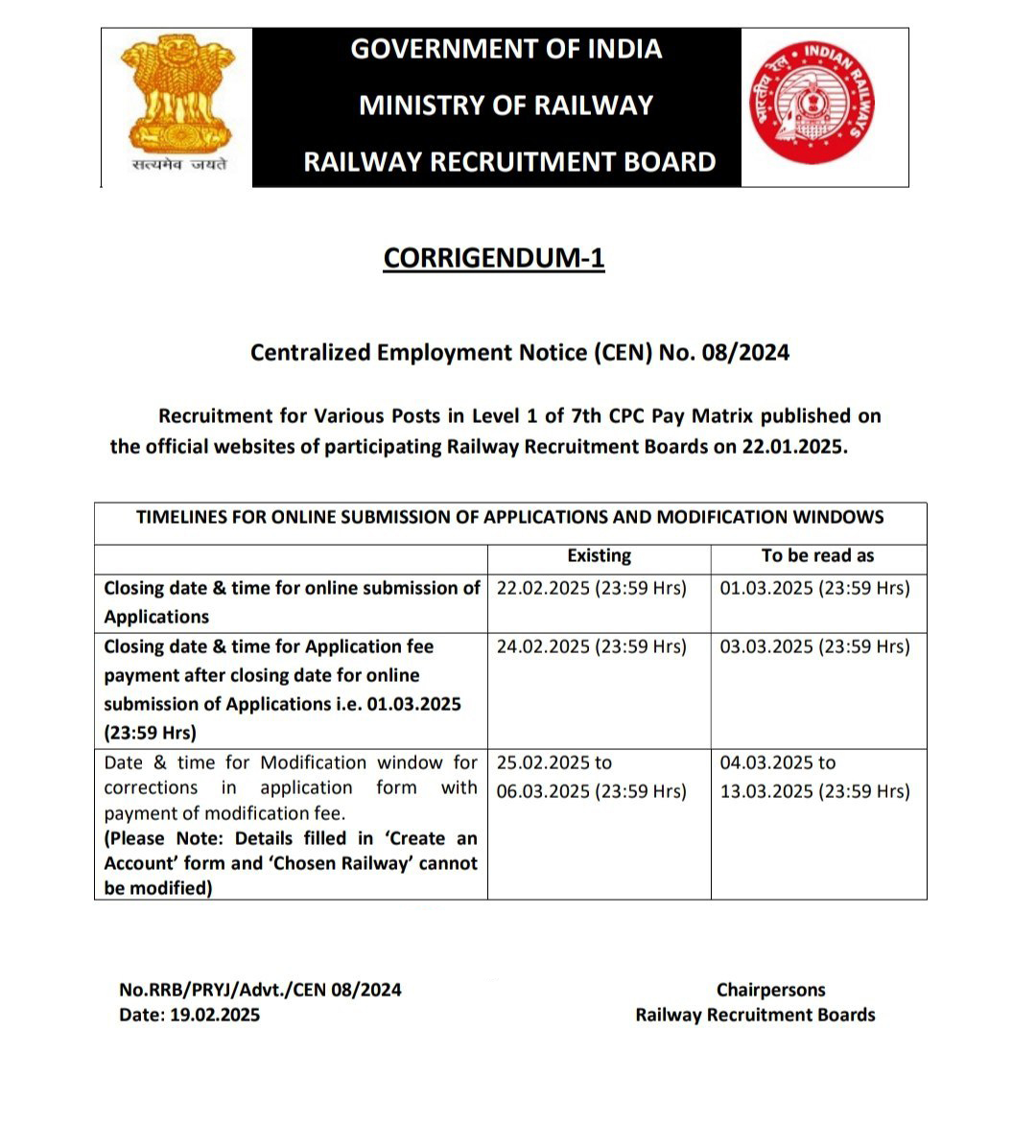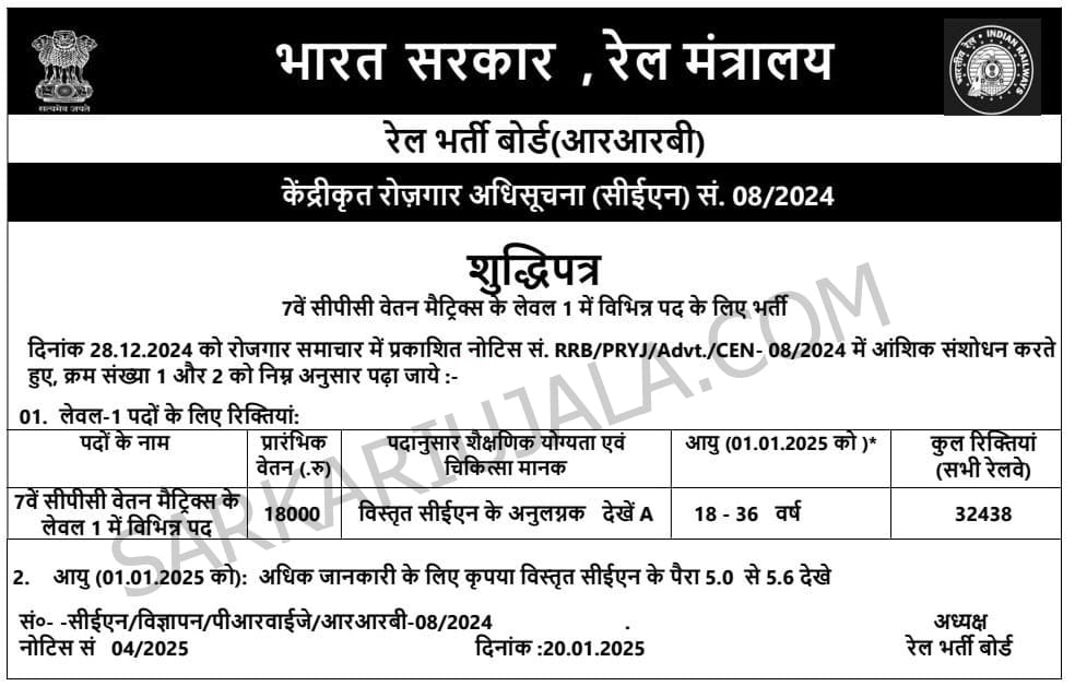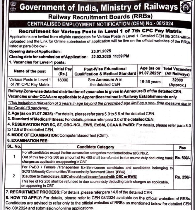 RRB Railway Group D Recruitment 2025Post Name – Group D (CEN- 08/2024)(Government Of India , Ministry Of Railways) | |||||