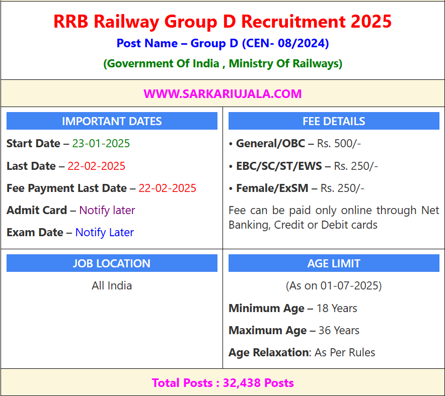 Post Description – RRB Railway Group D Recruitment 2024 is a major opportunity for job seekers in India. The application process starts on January 23, 2025, and ends on February 22, 2025. Candidates can pay the application fee online, which is ₹500 for General/OBC and ₹250 for EBC, SC, ST, EWS, Female, and ExSM categories. The recruitment offers approximately 32,000 vacancies across India, with an age limit of 18-36 years as of July 1, 2025, and age relaxation as per rules. Admit card and exam dates will be announced later. Stay updated on www.moneyujala.com. Details Of Recruitment Of RRB Railway Group D Online Form 2024Posts Name – Group D Number Of Posts – 32438 Posts Category Wise Posts – Western Railway (MUMBAI) – 4672 Posts North Western Railway (JAIPUR) – 1433 Posts South Western Railway (HUBLI) – 503 Posts West Central Railway (JABALPUR) – 1614 Posts East Coast Railway (BHUBANESWAR) – 964 Posts South East Central Railway (BILASPUR) – 1337 Posts Northern Railway (NEW DELHI)- 4785 Posts Southern Railway (CHENNAI)- 2694 Posts North Eastern Railway (GORAKHPUR)- 1370 Posts Northeast Frontier Railway (GUWAHATI)- 2048 Posts Eastern Railway (KOLKATA)- 1817 posts Central Railway (MUMBAI)- 3244 Posts East Central Railway (HAJIPUR)- 1251 Posts North Central Railway (PRAYAGRAJ)- 2020 Posts South Eastern Railway (KOLKATA)- 1044 Posts South Central Railway (SECUNDERABAD)- 1642 Posts Pay Scale – Level 1 (₹18000/-) Education Qualification – 10th pass or ITI or equivalent or National Apprenticeship Certificate (NAC) granted by NCVT How to Apply Online RRB Railway Group D Online Form 2024 – Candidates can apply through link provided below or they can also apply through official site of the Ministry Of Railways before 22/February/2025. Required Documents For Online Application – Educational Marksheet And Certificates Aadhar Card / Pan Card Passport Size Photo Signature Selection Mode – Written Exam Skill Test Medical Final Merit List | |||||