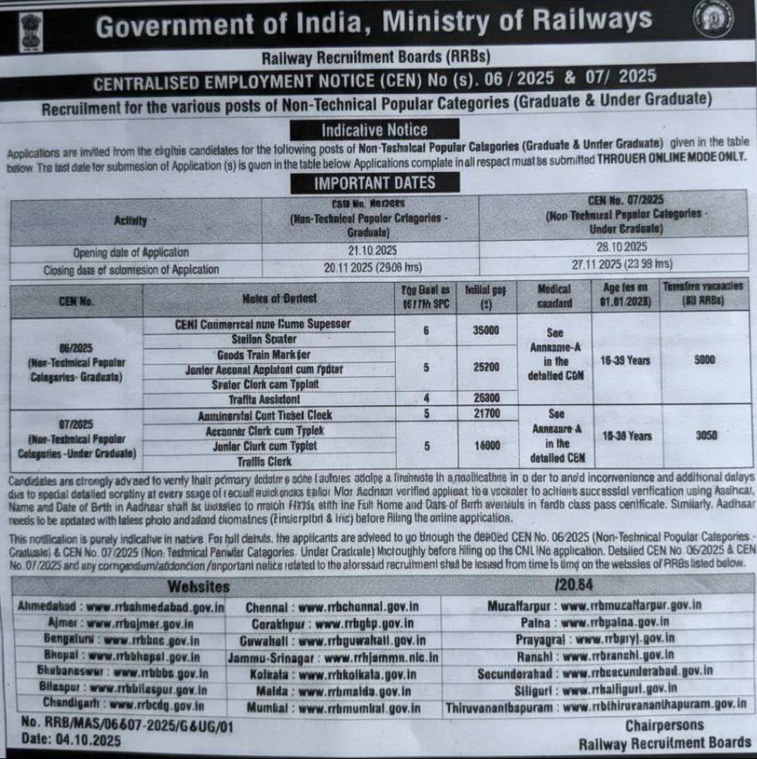 RRB Railway NTPC Recruitment 2025Post Name – Non Technical Popular Category (Graduate Level)ADVT No: – CEN 06/2025 (Railway Recruitment Board ) | |||||