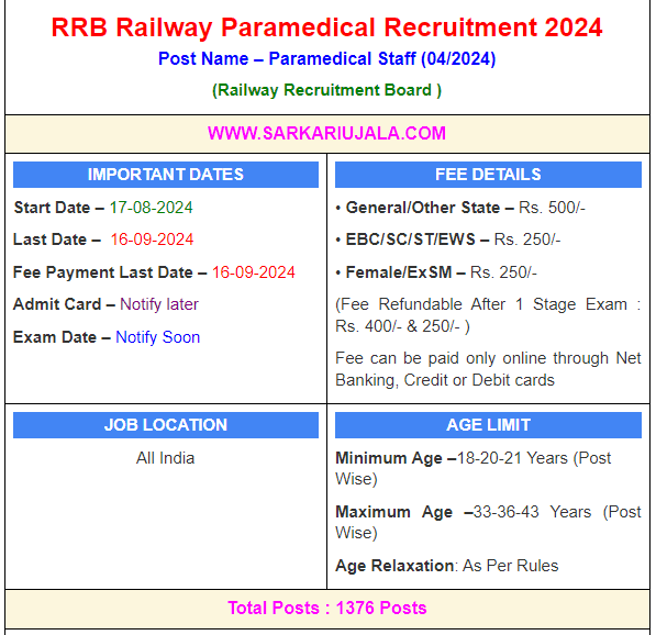 RRB Railway Paramedical Recruitment 2024Post Name – Paramedical Staff (04/2024)(Railway Recruitment Board ) | |||||