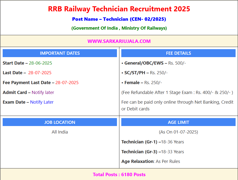 Post Description – RRB Railway Recruitment Board is inviting online applications for Technician for 6238 posts. Interested people meet all the eligibility criteria, apply online Details Of Recruitment Of RRB Railway Technician Online Form 2025Posts Name – Technician Number Of Posts – 6238 Posts Technician Grade I Signal – 183 Posts Technician Grade III Signal – 6055 Posts Pay Scale – As Per Rules Education Qualification – Technician Grade I Signal – Bachelor Degree With Science in Physics / Electronics / Computer Science / Information Technology / Instrumentation OR B.SC in a Combination of Any Sub Stream of Physics / Electronics / Computer Science / IT / Instrumentation OR BE / B.Tech / 3 Year Engineering Polytechnic Diploma in Above Basic Stream. Technician Grade III Signal – For S&T Trade : 12 Passed With Physics and Math OR 10th Passed with ITI Certificate from NCVT / SCVT. Other Trade : 10th Passed with ITI Certificate from NCVT / SCVT in Related Trade / Branch. How to Apply Online RRB Railway Technician Online Form 2025 – Candidates can apply through link provided below or they can also apply through official site of the Ministry Of Railways before 07/August/2025. Required Documents For Online Application – Educational Marksheet And Certificates Aadhar Card / Pan Card Passport Size Photo Signature Selection Mode – Written Exam Skill Test Medical Final Merit List | |||||