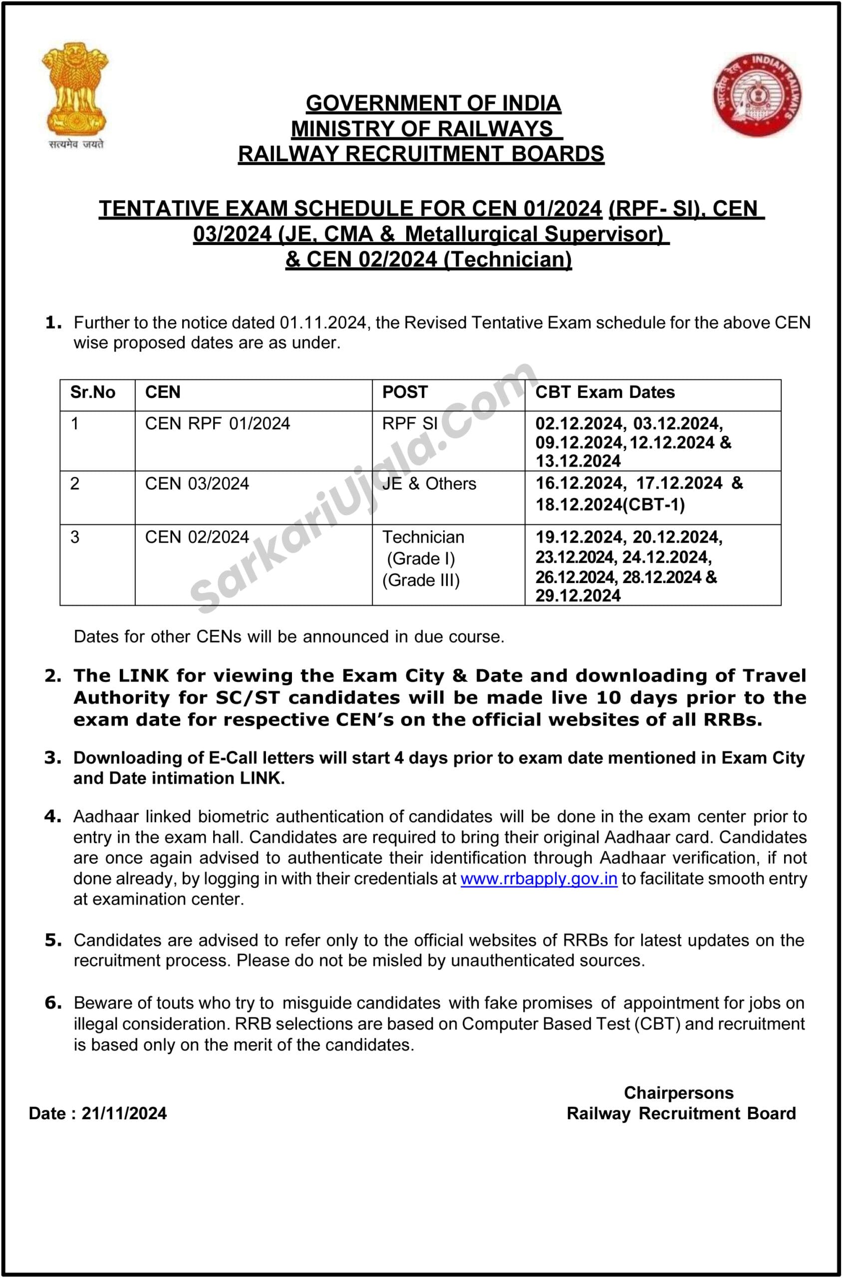 Post Description : Government Of India , Ministry Of Railways Has Been Released Exam Date For RRB Railway Technician Online Form 2024. Which Exam Date Is 16-26 December 2024 Interested People Download Admit card With Using Your Roll No & DOB . Instructions for Downloading the RRB Technician 01/2024 Admit Card : 1. In order to download their RRB Railway Technician 01/2024 Online Form candidates are required to go to the important link section provided below. 2. After getting the link candidates need to click it for downloading their RRB Technician 01/2024 Admit Card. 3. Candidates need to provide their following details-: Registration No. /Roll No. DOB/Password Captcha Code(if specified) 4. After providing their details appropriately candidates will be able to download their RRB Technician 01/2024 Admit Card. 5.Candidates can also download their Admit Card from official site of the RRB. | |||||