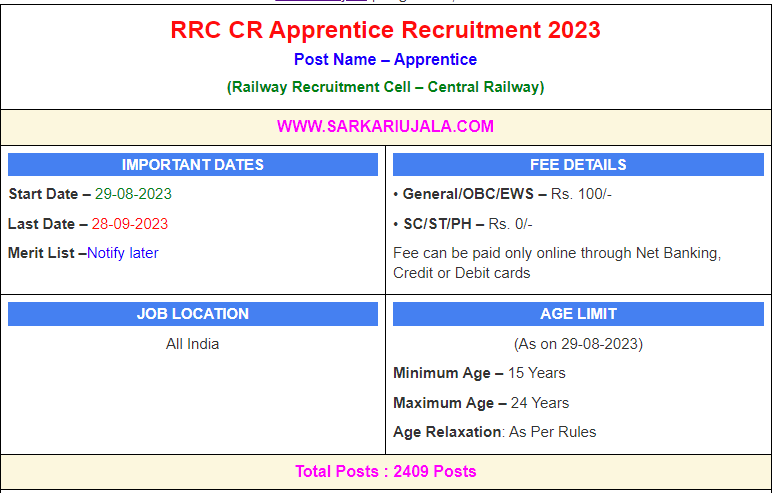 Post Description – Railway Recruitment Cell is inviting online applications for Apprentice for 2409 posts. Interested people meet all the eligibility criteria, apply online Details Of Recruitment Of RRC CR Apprentice Online Form 2023Posts Name – Apprentice Number Of Posts – 2409 Posts Categories Wise Posts : MUMBAI CLUSTER- 1649 Posts BHUSAWAL CLUSTER-418 Posts PUNE CLUSTER- 152 Posts NAGPUR CLUSTER-114 Posts SOLAPUR CLUSTER- 76 Posts Stipend – As Per Rules Education Qualification – 10th Passed With 50% Marks & ITI In Relevant Trade. How to Apply Online RRC CR Apprentice Online Form 2023 – Candidates can apply through link provided below or they can also apply through official site of the Railway Recruitment Cell before 28/September/2023. Required Documents For Online Application – 10th & ITI Mark sheet And Certificates Aadhar Card / Pan Card Passport Size Photo Signature Selection Mode – Merit List Doc Verification