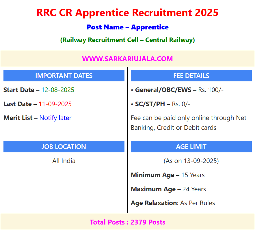 Post Description – Railway Recruitment Cell, Central Region is inviting online applications for Apprentice for 2379 posts. Interested people meet all the eligibility criteria, apply online Details Of Recruitment Of RRC CR Apprentice Online Form 2025Posts Name – Apprentice Number Of Posts – 2379 Posts Categories Wise Posts : MUMBAI CLUSTER- 1582 Posts BHUSAWAL CLUSTER- 418 Posts PUNE CLUSTER- 192 Posts NAGPUR CLUSTER- 144 Posts SOLAPUR CLUSTER- 76 Posts Stipend – As Per Rules Education Qualification – 10th Passed With 50% Marks & ITI In Relevant Trade. How to Apply Online RRC CR Apprentice Online Form 2025 – Candidates can apply through link provided below or they can also apply through official site of the Railway Recruitment Cell before 11/September/2025. Required Documents For Online Application – 10th & ITI Mark sheet And Certificates Aadhar Card / Pan Card Passport Size Photo Signature Selection Mode – Merit List Doc Verification