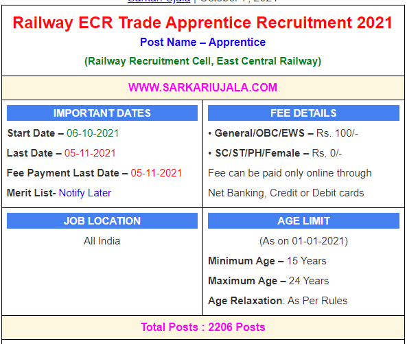 Post Description –Railway Recruitment Cell, East Central Railway is inviting online applications for Apprentice for 2206 posts. Interested people meet all the eligibility criteria, apply online Details Of Recruitment Of Railway RRC ECR Apprentice Online Form 2021Posts Name – Apprentice Number Of Posts – 2206 Posts Zone Wise Posts – Danapur Zone– 675 Posts Dhanbad Zone – 156 Posts Plant Depot/ Pt. Deen Dayal Upadhyaya – 135 Posts Samastipur Zone – 81 Posts Pandit Din Dayal Upadhyay- 892 Posts Coach Factory, Harnaut – 110 Posts Mechanical Factory, Samstipur – 110 Posts Sonpur Zone – 47 Posts Category Wise Posts – General – 1004 Posts OBC – 569 Posts SC – 304 Posts ST – 138 Posts EWS – 191 Posts Education Qualification – 10th Passed With 50% Marks & ITI Relevant Trade. How to Apply Online Railway RRC ECR Apprentice Online Form 2021 – Candidates can apply through link provided below or they can also apply through official site of the Railway Recruitment Cell before 05/Nov/2021. Required Documents For Online Application – 10th & ITI Mark sheet And Certificates Aadhar Card / Pan Card Passport Size Photo Signature Selection Mode – Final Merit List