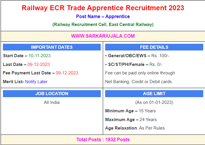 Post Description –Railway Recruitment Cell, East Central Railway is inviting online applications for Apprentice for 1832 posts. Interested people meet all the eligibility criteria, apply online Details Of Recruitment Of Railway RRC ECR Apprentice Online Form 2023Posts Name – Apprentice Number Of Posts – 1832 Posts Zone Wise Posts – Danapur Zone– 675 Posts Dhanbad Zone – 156 Posts Plant Depot/ Pt. Deen Dayal Upadhyaya – 135 Posts Samastipur Zone – 81 Posts Pandit Din Dayal Upadhyay- 518 Posts Coach Factory, Harnaut – 110 Posts Mechanical Factory, Samstipur – 110 Posts Sonpur Zone – 47 Posts Category Wise Posts – General – 851 Posts OBC – 467 Posts SC – 247 Posts ST – 111 Posts EWS – 156 Posts Education Qualification – 10th Passed With 50% Marks & ITI Relevant Trade. How to Apply Online Railway RRC ECR Apprentice Online Form 2023 – Candidates can apply through link provided below or they can also apply through official site of the Railway Recruitment Cell before 09/December/2023. Required Documents For Online Application – 10th & ITI Mark sheet And Certificates Aadhar Card / Pan Card Passport Size Photo Signature Selection Mode – Merit List